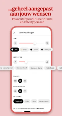 De Kobo-app is ontworpen om uw lees- en luisterervaring optimaal te personaliseren. Pas uw leesomgeving aan met heldere, scherpe tekst, kies uw favoriete lettertype en -grootte en schakel de nachtmodus in voor comfortabel lezen in het donker. Voor luisteraars zorgt onze intuïtieve audiospeler voor een naadloze ervaring: navigeer met gemak, zie altijd uw voortgang en stel een slaaptimer in voor ontspannen luisteren voor het slapengaan. Begin met lezen op een Kobo e-reader en vervolg uw verhaal moeiteloos in de Kobo-app, want uw voortgang wordt altijd gesynchroniseerd tussen al uw apparaten.