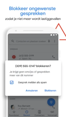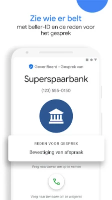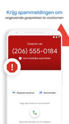 Neem de controle terug over uw inkomende gesprekken met de app Telefoon, ontworpen om uw communicatie helder en veilig te houden. Zeg vaarwel tegen ongewenste onderbrekingen; Telefoon waarschuwt u proactief voor verdachte nummers van spammers, telemarketeers en oplichters, zodat u ze eenvoudig kunt vermijden. Met de geavanceerde beller-ID-functionaliteit van Google ziet u direct welke organisatie belt, nog voordat u opneemt. Dit geeft u de gemoedsrust om alleen de gesprekken aan te nemen die er echt toe doen.